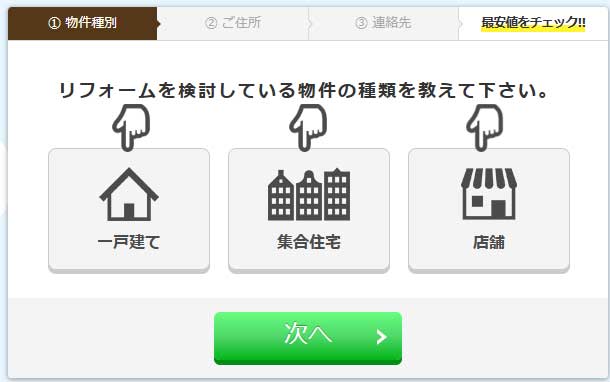 住まいの地域・リフォームしたい箇所・連絡先を入力します(選ぶだけ簡単)